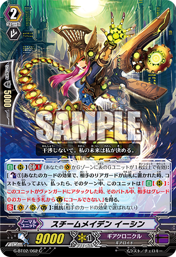 【自】【(V)】【Gブレイク】(1)(あなたの(V)かGゾーンに表のGユニットが1枚以上で有効):[【カウンターブラスト】(1)] あなたのカードの効果で、相手のリアガードが山札に置かれた時、コストを払ってよい。払ったら、そのターン中、このユニットは『【自】【(R)】:このユニットがヴァンガードにアタックした時、そのバトル中、相手はグレード0のカードを手札から(G)にコールできない。』を得る。
